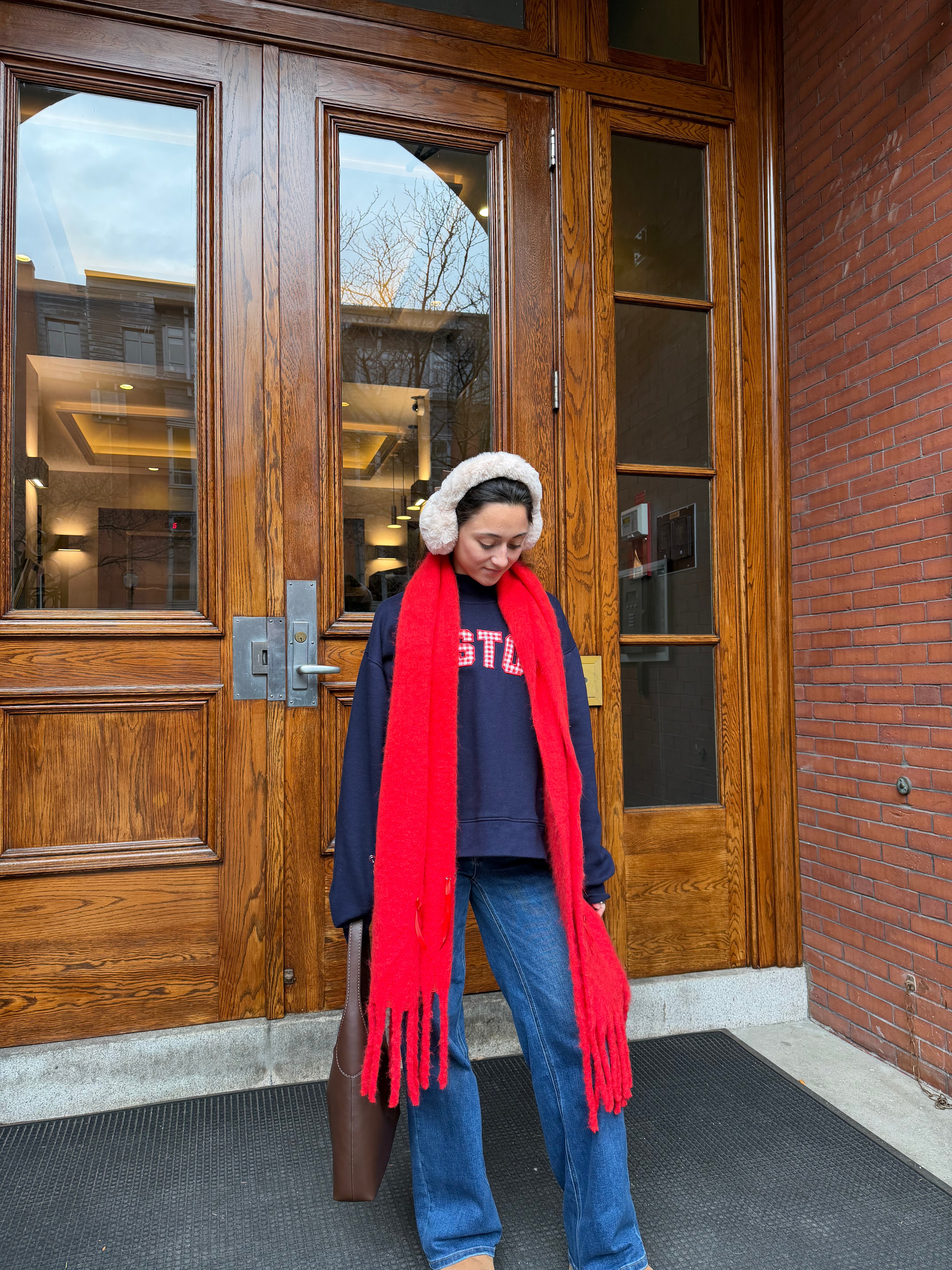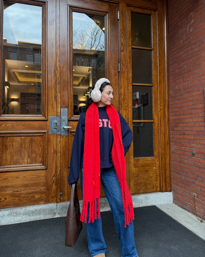 Your new everyday staple. The Boston mockneck features bold red Gingham-style varsity letters, a cozy fleece-lined interior, and the perfect oversized fit. Made from a 65% cotton blend, it's soft, warm, and easy to throw on after pilates, the beach, or heading to class.
