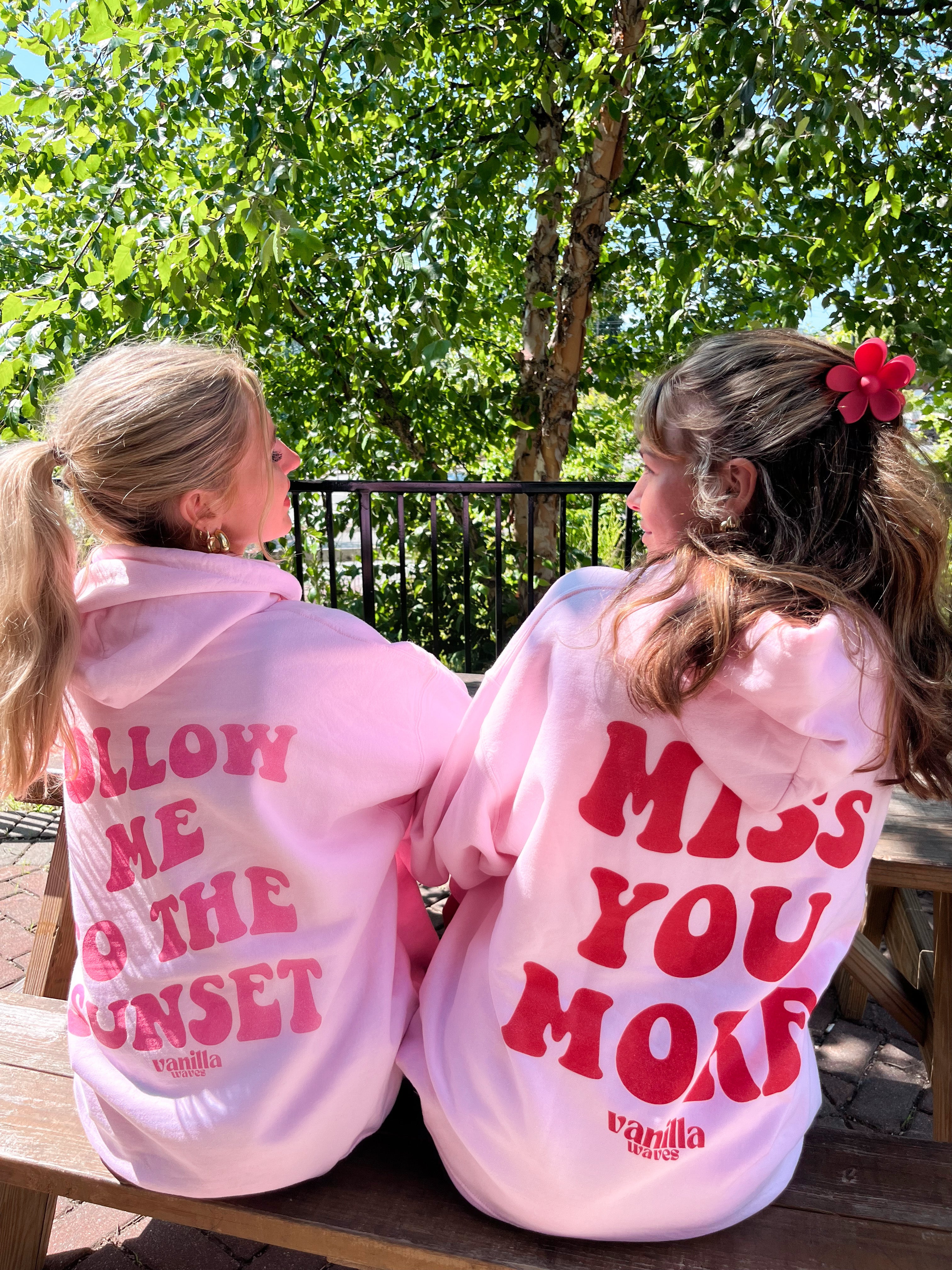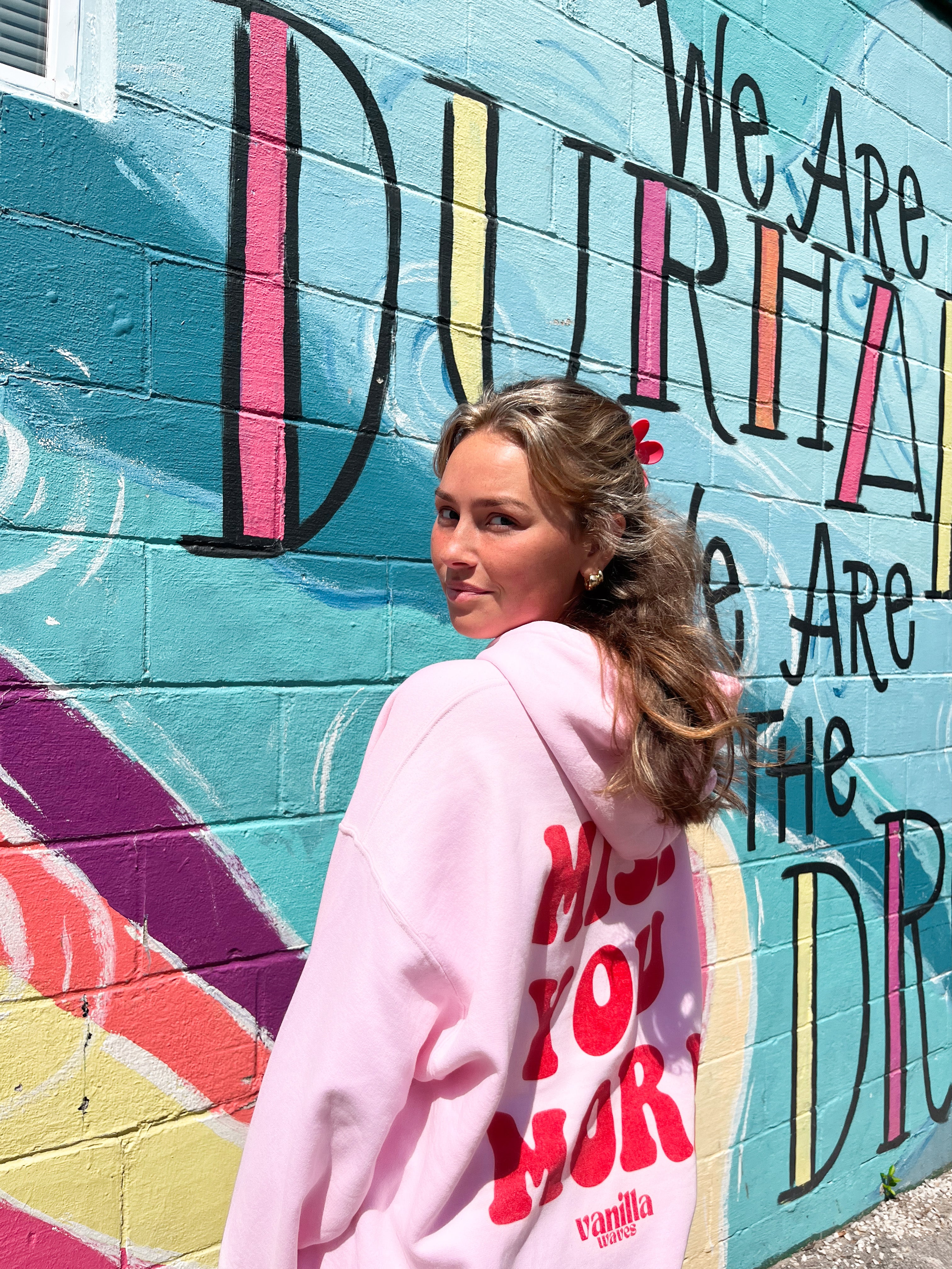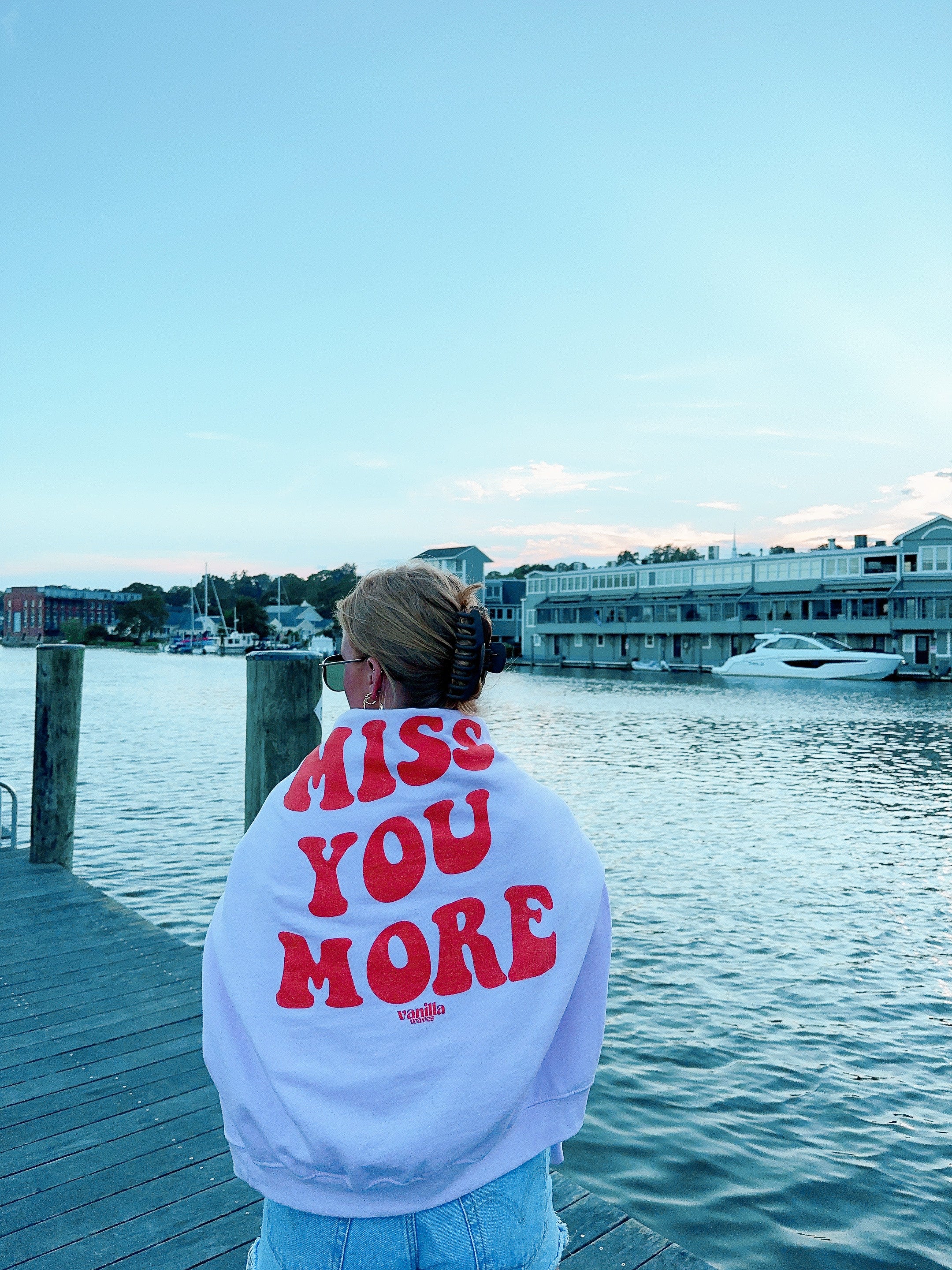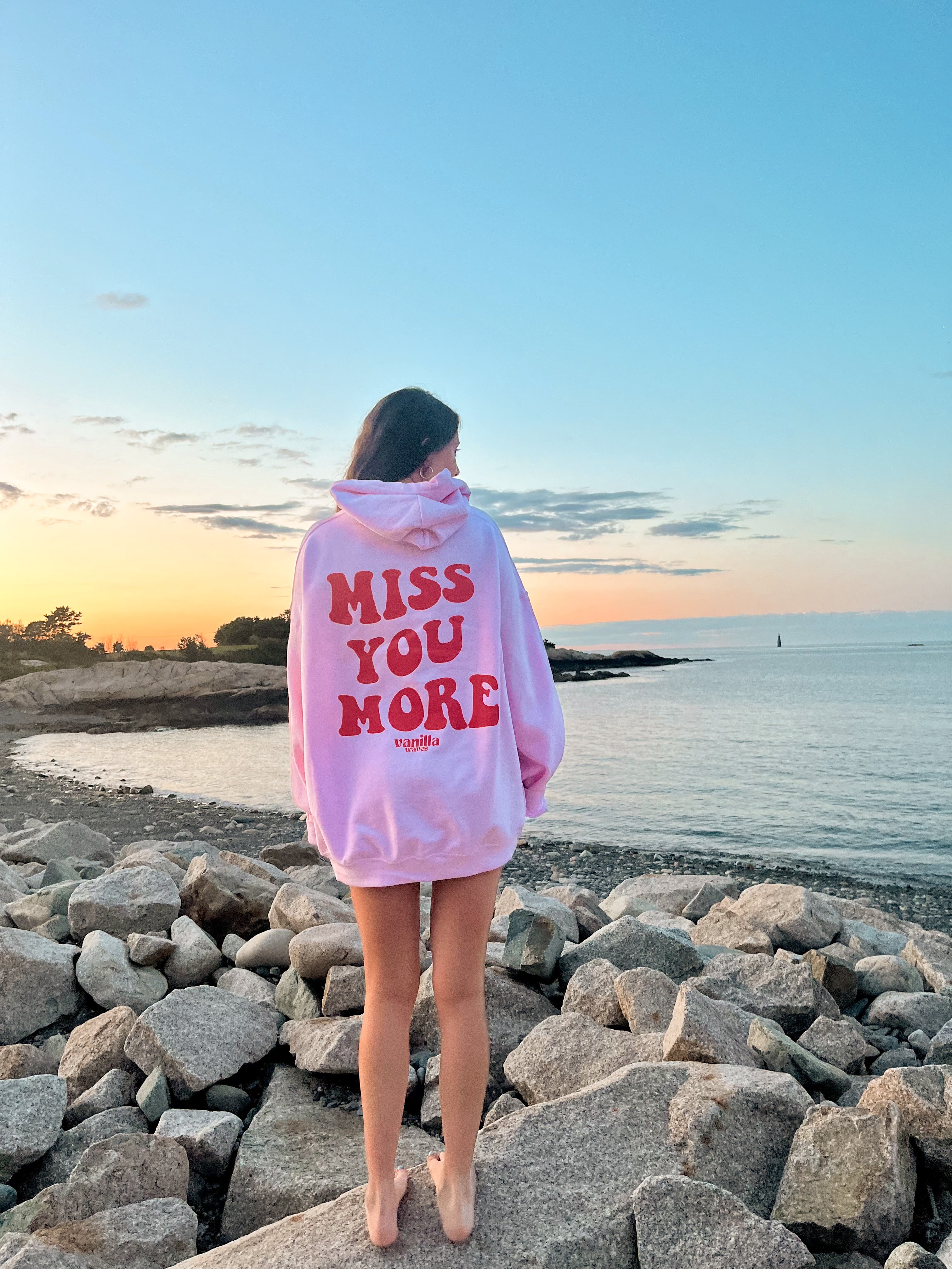 Our MISS YOU MORE hoodie is super trendy right now! With a cute light pink color and red lettering, you won't be able to resist this cozy hoodie.